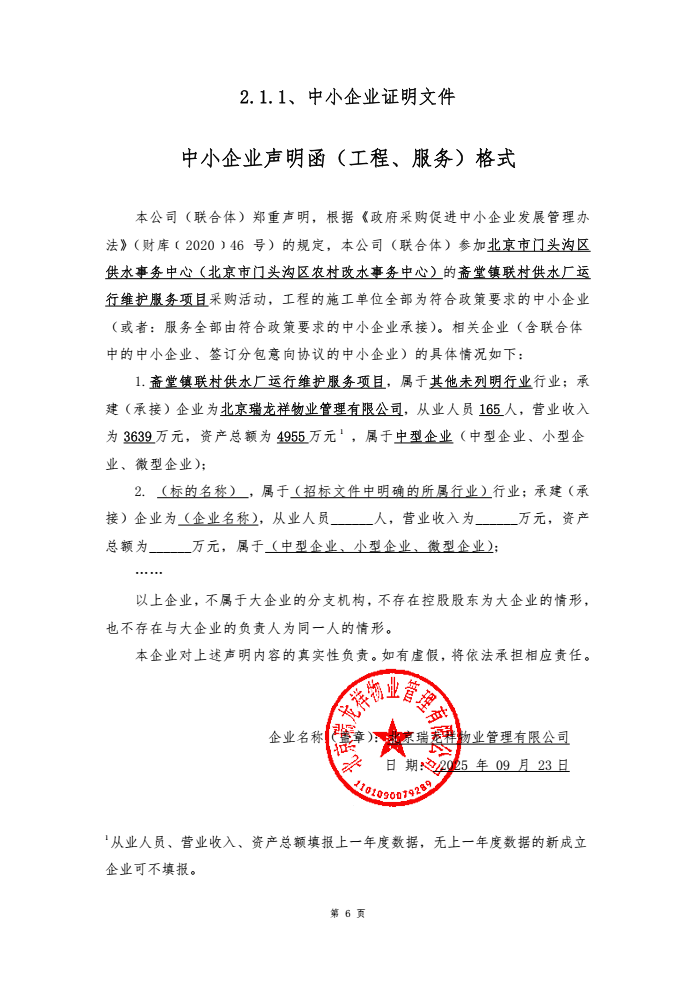 简要技术要求:斋堂镇联村供水厂运行维护服务项目的全部内容,详见招标文件第五章采购需求
